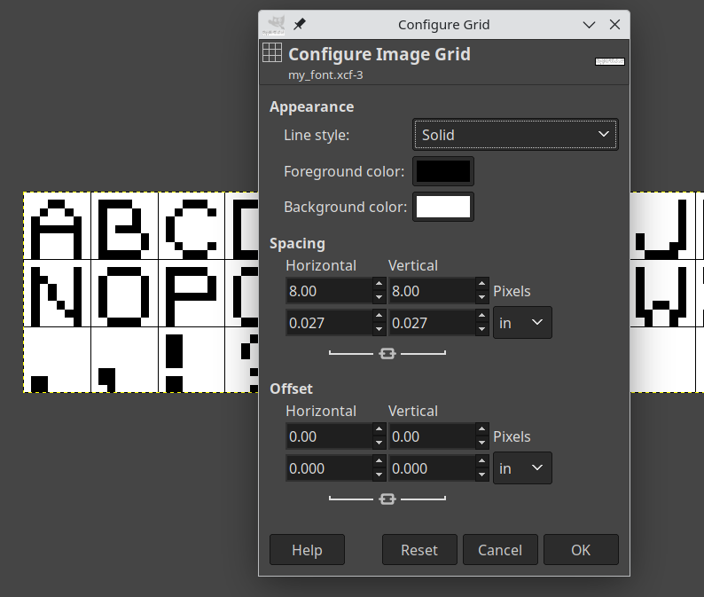 In order to write anything, we need a font. The Gameboy doesn’t supply anything, nor does RGBDS come with any assets. So we’ll just create one with an image editing program, in my case GIMP. In GIMP, I found it helpful to use the grid overlay to create 8x8 pixel squares, and then using the 1 pixel brush, draw the characters.